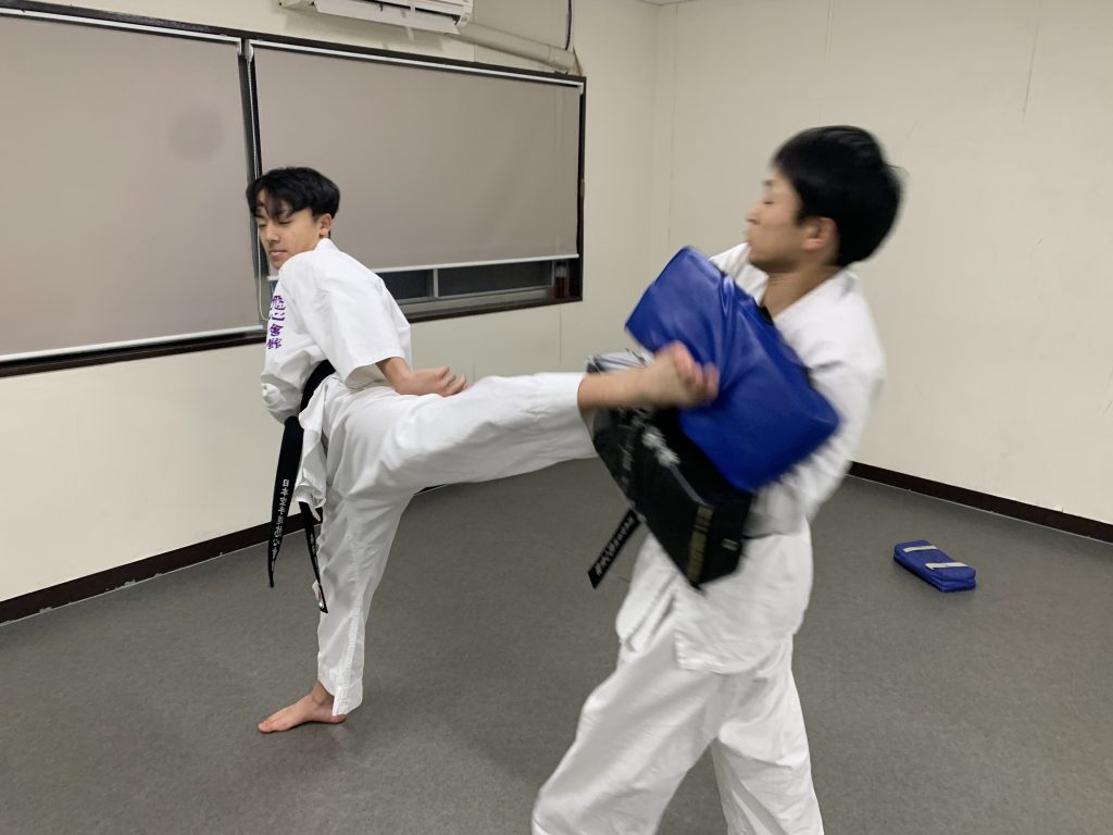 ミット稽古では脛を付けた状態から、中段回し蹴りを蹴り込む練習をしました。