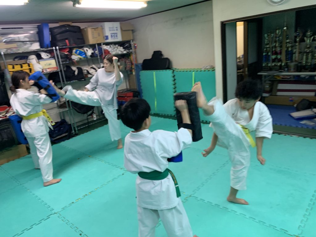 本日の片江道場の一般部では、ミット稽古で上段前蹴りの練習をしました。