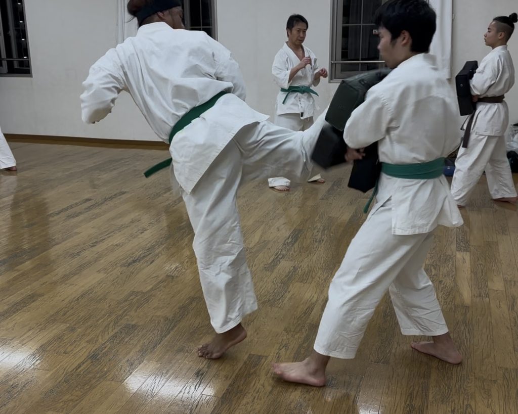 一般部のミット稽古では、後ろ蹴りを実施。
