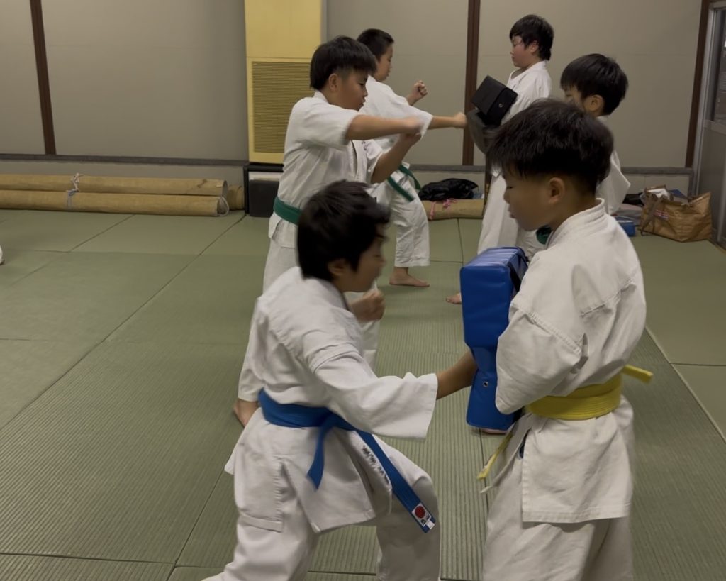 少年部ミット稽古は下突きです。体重移動を意識して全身をぶつけて行く様に突きたいですね!組手でも多様する技なのでしっかり身に付けましょう!