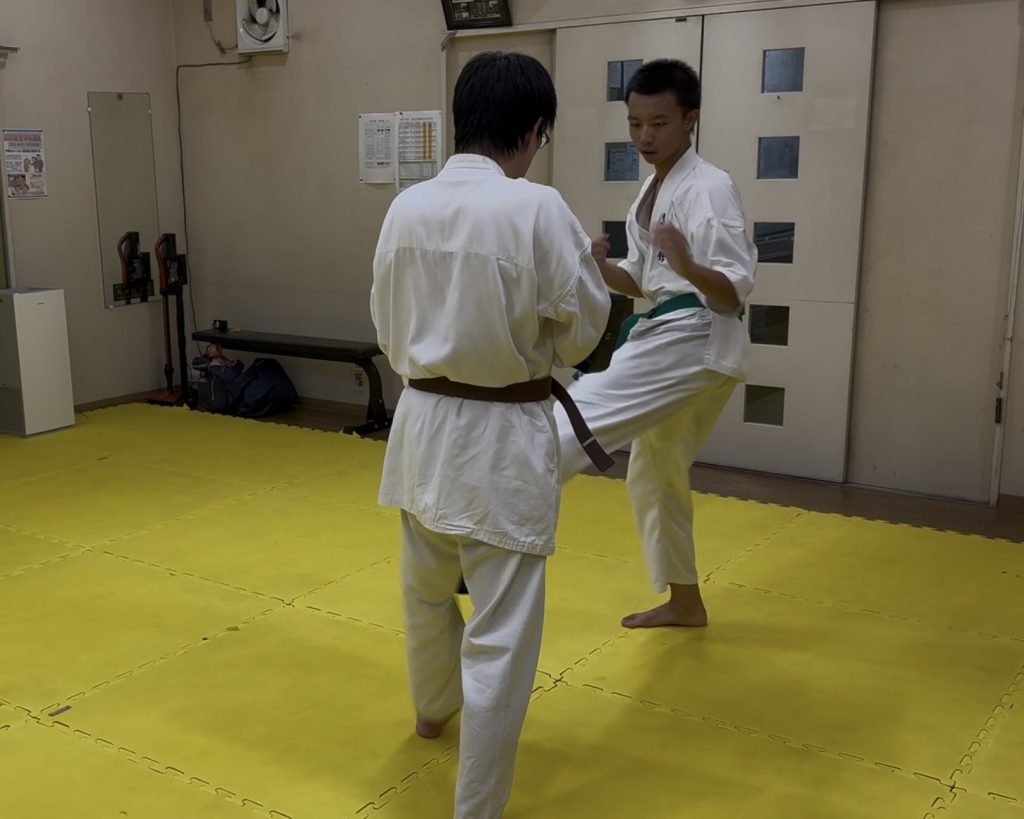 一般部のミット稽古ではゆうと先生にお手本になってもらい下段回し蹴りの練習。角度を付けてしなやかに!
