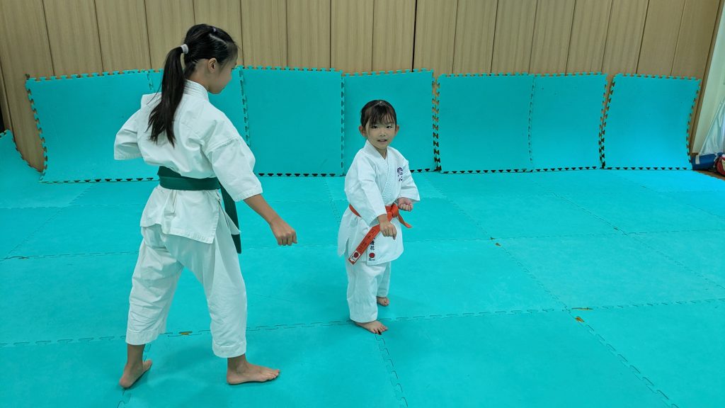 演武会に向けて型の練習!じょうすけ君とおうせい君に先輩白帯としてお手本になってもらいました。見られると意識も変わりますね!