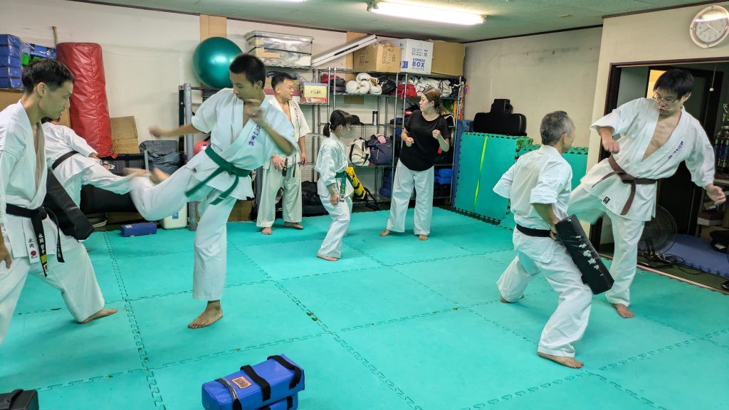 一般部のミット稽古は下段回し蹴りの練習。膝から先の角度と振りをしっかり身に付けましょう!